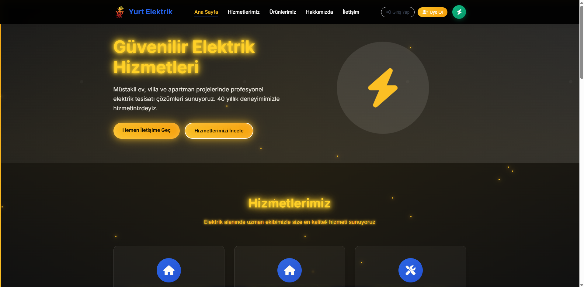 DİKKAT !! “Fiyatlar proje kapsamına göre değişiklik gösterebilir. Net teklif için ücretsiz ön görüşme yapılır.” 🎨 Tasarım Anlayışı Tema; siyah ve koyu gri arka plan üzerine konumlandırılmış sarı neon vurgular ile elektrik enerjisini ve gücü simgeler. Işık efektleri, yumuşak geçişler ve minimal animasyonlar sayesinde hem modern hem de dikkat çekici bir kullanıcı deneyimi sunar. Karanlık (Dark Mode) odaklı premium tasarım Neon sarı detaylarla yüksek kontrast Gözü yormayan, okunabilir tipografi Enerji ve güç temalı ikonografi 🧠 Kullanıcı Deneyimi (UX) Tema, ziyaretçinin aradığı bilgiye hızlıca ulaşmasını hedefler: Hero alanı güçlü bir başlık ve açıklama ile hizmeti net şekilde anlatır Hemen aksiyon alınabilmesi için öne çıkarılmış CTA butonları “Hemen İletişime Geç” “Hizmetlerimizi İncele” Hizmetler bölümü sade kart yapısı ile kolay anlaşılır Bu yapı, özellikle müşteri dönüşüm oranını artırmaya yönelik olarak kurgulanmıştır. 🏗️ Kimler İçin Uygun? Bu tema özellikle aşağıdaki sektörler için idealdir: İnşaat Firmaları & Diğer İşletmeler Elektrik ustaları & teknik servisler İnşaat & yapı firmaları Villa, apartman ve site projeleri Kurumsal veya bireysel hizmet sağlayıcılar Yerel işletmeler için de güçlü bir kurumsal vitrin görevi görür. 📱 Responsive & Modern Yapı Tema tamamen responsive olup: Mobil Tablet Masaüstü cihazlarda kusursuz görüntü sunar. Günümüz web standartlarına uygun modern bir yapıya sahiptir. 🔧 Özelleştirme Kolaylığı Renkler kolayca değiştirilebilir Logo ve marka uyarlaması hızlıdır Metinler ve ikonlar basit şekilde düzenlenebilir Farklı sektörlere uyarlanabilir esnek yapı Bu sayede tema, sadece elektrik sektörüyle sınırlı kalmadan çok amaçlı kurumsal tema olarak da kullanılabilir. 💼 Profesyonel & Satış Odaklı Tema, sadece “güzel” görünmek için değil; müşteri güveni kazanmak, iletişim başlatmak ve satışa dönüştürmek için tasarlanmıştır. Kurumsal imaj Net hizmet anlatımı Güçlü ilk izlenim Yüksek dönüşüm potansiyeli
